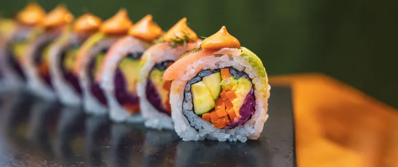 2 gohan l base arroz y sésamo, 5-ingredientes a elección, 1-rolls palta ebi o tempura ebi, 2-Bebidas express
